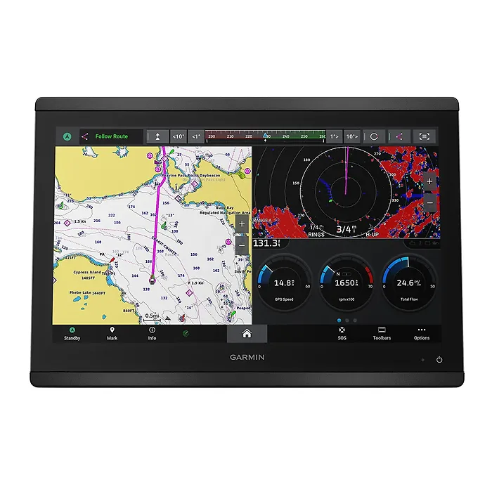 The GPSMAP®8616 chartplotter features a 16” full HD in-plane switching touchscreen display for wider viewing angles, superior clarity, and sunlight readability, even with polarized sunglasses. Experience superior connectivity and networking solutions with complete control of your entire system, right at your fingertips. The device is preloaded with Garmin Navionics+™coastal charts and inland mapping that feature Auto Guidance+™technology (Auto Guidance+ is for planning purposes only and does not replace safe navigation operations). Plus, there’s support for optional Garmin Navionics Vision+™premium map content. The chartplotter includes a premium-performance processor for our fastest map drawing, superior networking, video distribution, and more. Multiple displays can be flat-mounted edge-to-edge to create a sleek glass helm look or mounted flush. NMEA 2000®networking and the Garmin Marine Network allow you to build your full marine electronics suite — from radar and autopilots to cameras and instruments — controlled from your chartplotter and shared across multiple screens. With SmartMode™station controls, everything is designed to give you quick, one-touch access to the information you need to ease high-stress situations such as docking. For full control of your boat on your chartplotter screen, use our exclusive OneHelm™feature to connect to many compatible third-party devices. Built-in Garmin SailAssist™features provide data, displays, and prerace guidance needed to gain a competitive edge. Download the ActiveCaptain® smartphone app to your smartphone or tablet to manage your marine experience from anywhere — from trip planning and prefishing to purchasing, downloading, and updating maps. See RPMs, fuel flow, temperature, trim, and more for up to four of your compatible Mercury®engines by using the SmartCraft®Connect gateway.