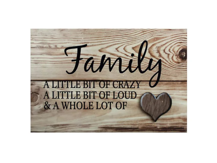 Give your home a dash of decorative love with This Family Wall Art. Ideal for living room, dining room, or any family gathering areas. Wall art says: FAMILY, a little bit crazy, a little bit of loud & a whole lot of love. Wall art features a three-dimensional heart and is made of medium-density fibreboard. Piece is approximately 11.75" x 7.75" x 1.25" in size and includes a sawtooth hanger for easy installation.