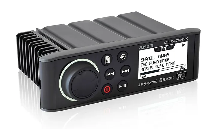 Model: 010-01516-30Introducing the MS-RA70NSX, Fusion’s sleekest value-packed marine stereo now with SiriusXM capability, designed to deliver a quality on-water entertainment experience by incorporating some of the latest marine technologies. The MS-RA70NSX is engineered to seamlessly replace any standard DIN sized non-marinized stereo without the need to reconfigure dash space. Clever styling gives the installer the option of either mounting the stereo with a conventional flush finish or integrating it flat into a glass helm, ensuring a high-end finish to the installation.
