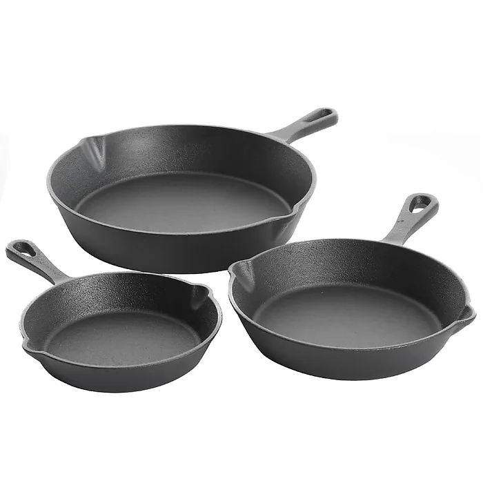 Eggs, stir fry, steaks, and more are the meals you can enjoy with this Gibson Home Brickstone 3 Piece Pre-Seasoned Cast Iron Skillet Set. Made from durable cast iron, these heavy set skillets are rugged and sturdy. Being pre-seasoned, you can use these right away and start cooking gourmet meals. The dual pouring spouts makes it easy to drain water, fat, oils, and any other liquid from your dish. Hanging holes on the handles means these can be hung up for easier storage. Make the meals of your dreams with this great skillet set today.
