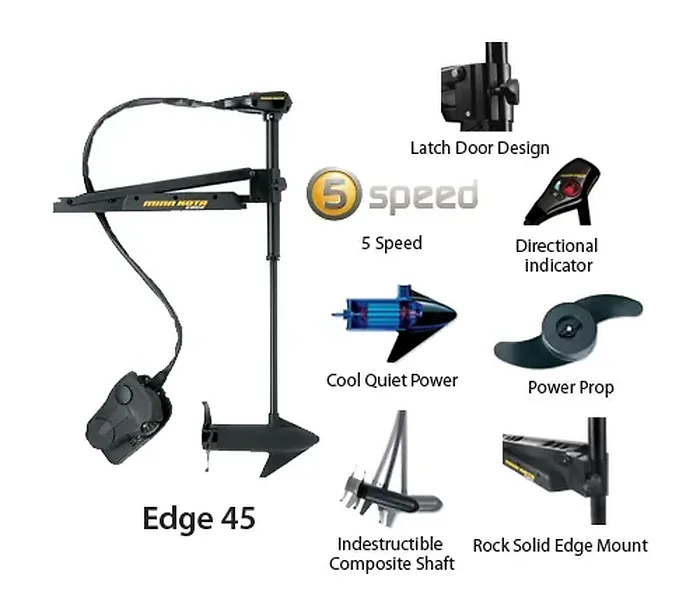 Edge 45 lb. 45" foot-control trolling motor, MKP-2 Prop, hold down strap, and mounting hardware.
