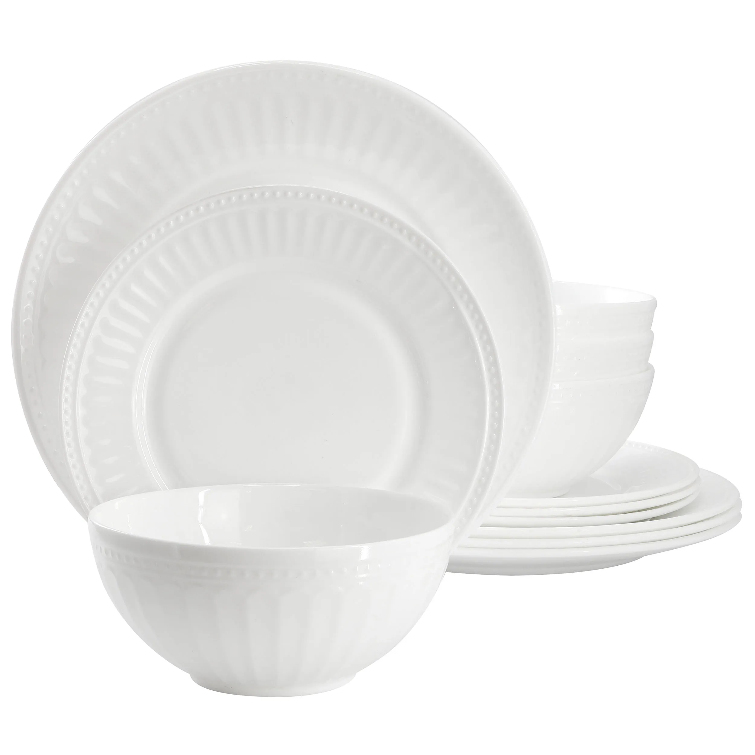 The Gibson Swanton 12-Piece Break-Resistant Opal Glass Dinnerware Set blends durability with modern elegance, making it a wonderful addition to any kitchen. This set is crafted from premium opal glass and showcases a striking embossed stripe design on a pristine white backdrop.