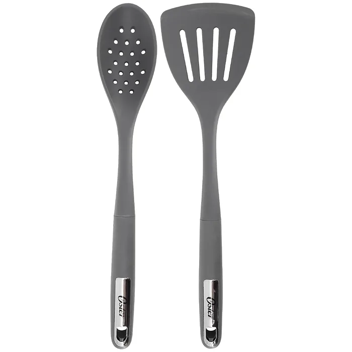 Upgrade your kitchen with the Oster Ridgecrest Silicone Kitchen Tool Set, featuring a Slotted Spoon and Turner in a chic Gray finish. These essential cooking tools combine functionality, durability, and modern aesthetics.
