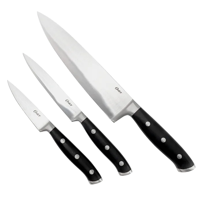 The Oster Ginley Stainless Steel Knife Set is an essential for any kitchen, perfect for both amateur cooks and experienced chefs. This premium knife collection includes an 8" chef knife, a 5" utility knife, and a 3.5" paring knife, all made from high carbon stainless steel to ensure exceptional durability and sharpness.