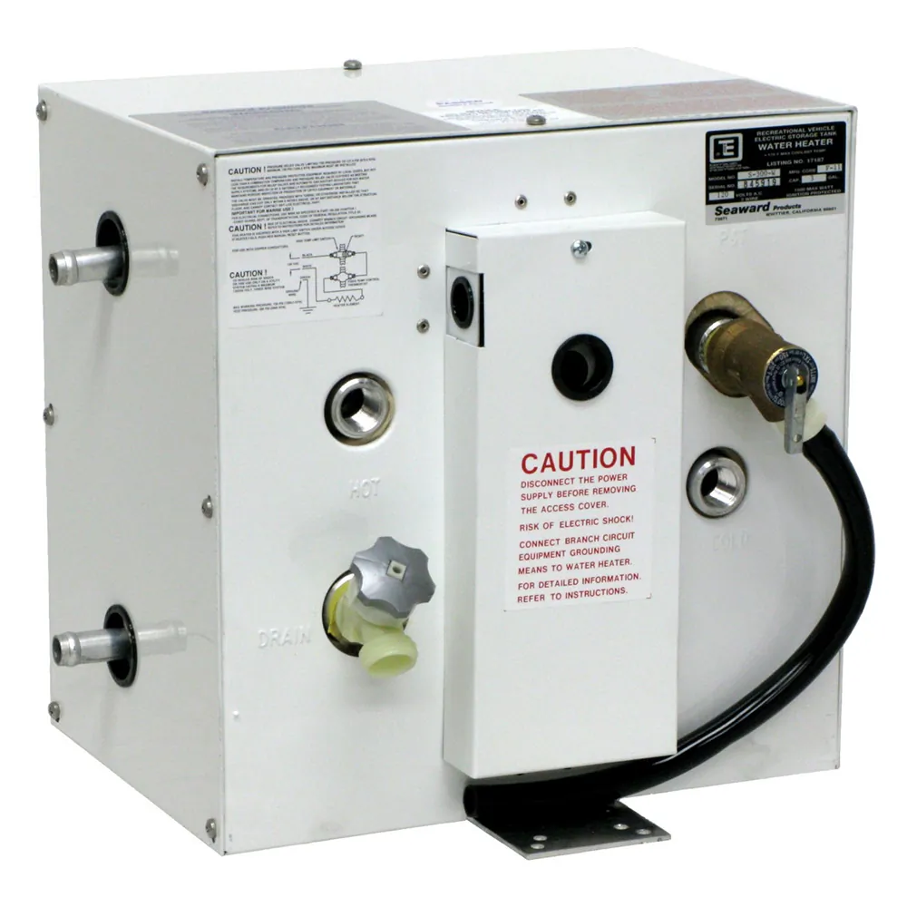 The "1700 Series" water heater provides hot water for galley and shower. Dense foam insulation provides better and longer heat retention than traditional fiberglass. The tank itself is protected by a 75 PSI T& P (temperature and pressure) relief valve. The cylindrical design of the tank enables it to withstand more pressure than a cube shaped tank.