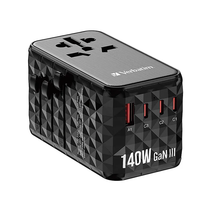 The Verbatim GaN III Universal Travel Adapter is a compact and versatile solution for travelers.This adapter supports over 180 countries, offering EU, UK, US, Australia, and China plug options. Utilizing advanced GaN III technology, it's more efficient and compact. This 5-in-1 adapter allows simultaneous charging of five devices through AC and USB ports, including two (2) USB-C with Power Delivery 3.1 (with PPS support), Quick Charge 4+ output, up to 140W each, one (1) USB-C up to 18W, and one (1) USB-A ports up to 18W.Ideal for international travel, this adapter gives you 100% peace of mind wherever you may go.Verbatim's GaN III Universal Travel Adapter comes with a 2-year Limited Lifetime warranty.