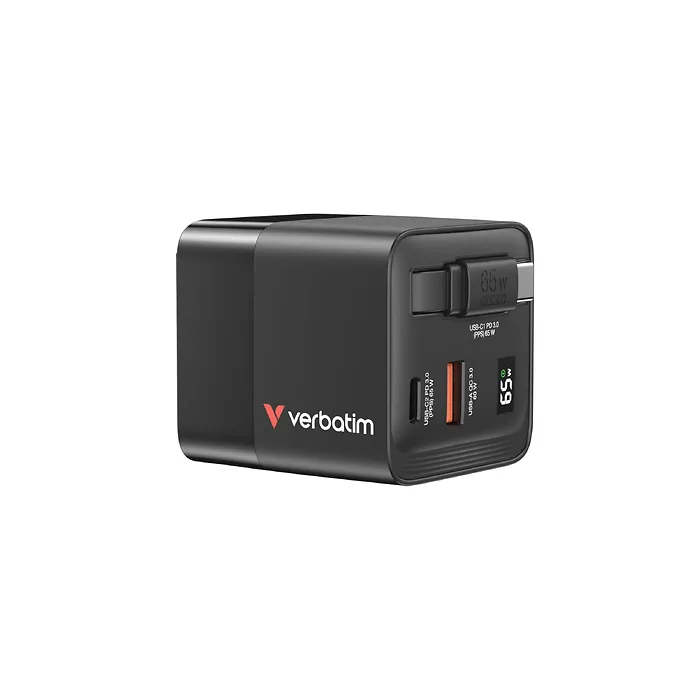 Verbatim's 65W GaN Charger combines a USB-Cr and USB-A port plus an integrated retractable USB-C cable into a compact, palm-sized design. Capable of charging up to 2 devices simultaneously, the USB-C port and cable support PD 3.0 (Power Delivery) at 65W while the USB-A port supports QC 3.0.The retractable USB-C cable included with this charger extends to over 80cm , reducing the need for additional cables when on the move and the output display shows the total amount of power output being used, whether that is from one or a combination of ports.This charger features innovative GaN technology that minimizes heat generation, delivering safer and more efficient charging in a portable form factor. This charger supports USB Power Delivery 3.0, PPS, and Quick Charge 3.0, 4, and 4+ standards. Compact in size, this charger includes foldable US prongs, and replaceable EU and UK plugs, also making it travel-ready.Built from flame-resistant polycarbonate, the Verbatimrs GaN Charger 65W with Retractable Cable comes in eco-friendly packaging with a 1-year warranty.