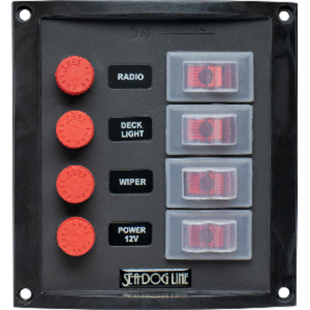 The Splash Guard Vertical 4-Gang Rocker Switch Panel features six 15A 12VDC illuminated SPST On/Off rocker switches and six fuse holders for use with standard AGC 1/4” x 1-1/4” glass style fuses. Individual circuit 10A max. 37A total. The addition of splash guard switch covers make this panel ideal for use where the front might be subject to light spray or water (NOT designed for total immersion). These fire resistant panels are suitable for use in engine room compartments. Includes a mounting gasket and a sheet of 20 preprinted decals to customize to your specific application. Constructed of injection molded nylon. Installs with six #6 RH fasteners (not included). CE compliant. 12VDC.