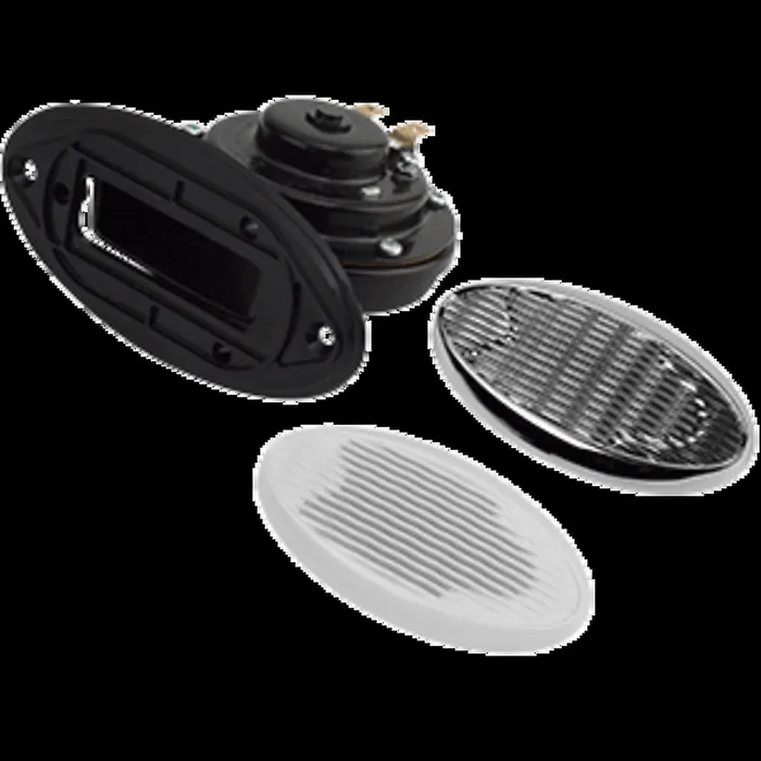 Drop-In Hidden Horn V.1 with Grills is constructed of powder coated steel and injection molded nylon. Kit includes horn plus one chrome and one white decorative billet snap-in grill. Hole size 1-7/8" x 3-3/8". At 106 decibels and a frequency (Hz) of 440±20A, this horn meets US Coast Guard's COLREGS and ABYC standard A-23 for use on vessels under 12m (39'). 12VDC. NMMA Type Accepted #2577064.