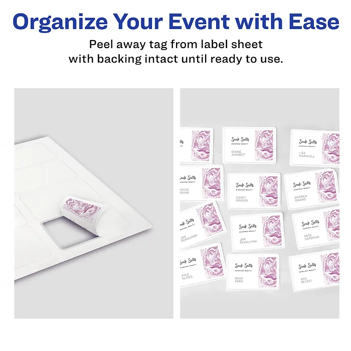 General InformationManufacturer:Avery Manufacturer Part Number:5395 Manufacturer Website Address:http://www.avery.com Brand Name:Avery® Product Name:Adhesive Name Badges Marketing Information:Create professional-looking name badges instantly with a laser or inkjet printer. Self-adhesive labels adhere firmly and remove easily. Flexible badge moves with clothing without the edges curling up or the badge falling off. Unique peel-away design allows badges to separate easily from the printed sheet while the individual badge backing remains intact until ready to use. The 8-1/2" x 11" sheets feed automatically from your printer's paper tray. Each sheet has eight labels. Each 8.3 mil thick badge measures 2-1/3" x 3-3/8". Durable adhesive is safe for most fabrics, but is not recommended for vinyl, plastic, leather, suede, velvet, corduroy, silk and other delicate fabrics. Avery offers many easy-to-use templates for Microsoft Word and other popular software programs.