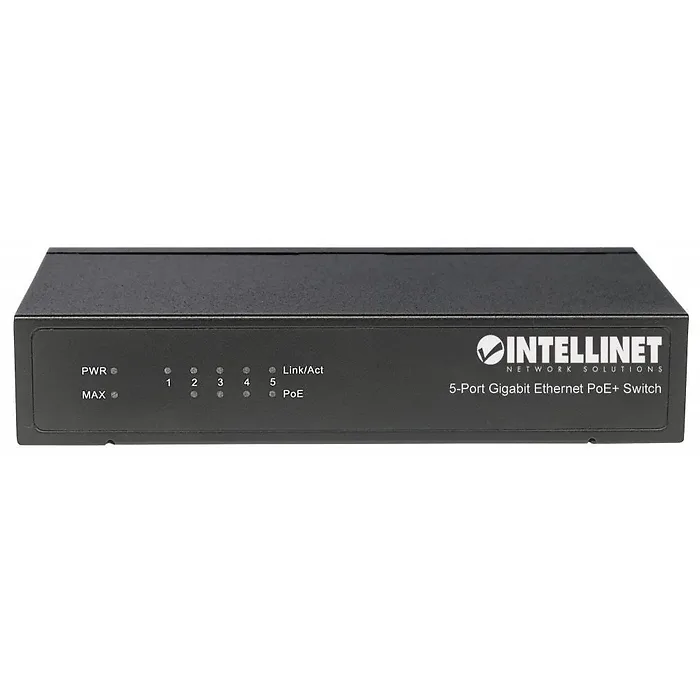 Provides power and data connection for up to four PoE network devices Save installation cost by delivering data and power over existing network cablesIEEE 802.3at/af-compliant RJ45 PoE/PoE+ output ports Green Ethernet power-saving technology deactivates unused ports and adjusts power levels based on the cable lengthPower output up to 30 watts per port PoE power budget of 60 wattsSupports IEEE 802.3at and IEEE 802.3af-compliant PoE devices (wireless access points, VoIP phones, IP cameras) Supports IEEE 802.3at/af detection and short circuit, overload and high-voltage protectionAll RJ45 ports equipped with Auto-MDIX and auto-negotiation support Complies with the IEEE 802.3az (Energy Efficient Ethernet EEE) specificationStore and forward switching architecture 10 Gbps switch fabricSupports jumbo frames up to 9 kBytes IEEE 802.3x flow control for full duplexFanless design ideal for silent operation Desktop-size metal caseStandards IEEE 802.3 (10Base-T Ethernet) IEEE 802.3u (100Base-TX Fast Ethernet) IEEE 802.3ab (1000Base-T Gigabit Ethernet) IEEE 802.3af (Power over Ethernet 802.3at Type 1) IEEE 802.3at (Power over Ethernet 802.3at Type 2) IEEE 802.3az (Energy Efficient Ethernet EEE)Packet filter/forwarding rate: - 1,488,000 pps (1000 Mbps) - 148,800 pps (100 Mbps) - 14,880 pps (10 Mbps)MAC address table: 2k entries Buffer memory: 192 kBBackplane speed: 10 Gbps Switch architecture: store and forwardPinout RJ45 output ports (Data + Power) - IEEE Alternative A - Pin 1: Vport [+] - Pin 2: Vport [+] - Pin 3: Vport [-] - Pin 4: Unused - Pin 5: Unused - Pin 6: Vport [-] - Pin 7: Unused - Pin 8: UnusedCertifications: FCC Class B, CELEDs Power Link/activity PoE MaxPower External power adapter: 51 V, 1.25 A, input: 100 – 240 V AC, 50 – 60 Hz Power consumption: 70 watts (maximum)Metal housingDimensions: 76 (L) x 140 (W) x 27 (H) [mm] / 2.99 (L) x 5.51 (W) x 1.06 (H) [in]Weight: 0.71 kg (1.57 lbs.)Operating temperature: 0 – 40°C (32 – 104°F) Operating humidity: 10 – 90% RH, non-condensing Storage temperature: -20 – 70°C (-4 – 158°F)Package Contents 5-Port Gigabit Ethernet PoE+ Switch Power Adapter Quick Installation Guide