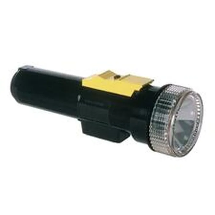 Tubular-shaped flashlight has a three-way switch for on, off, and flasher functions. Flashlight also offers a roll-resistant design and clear pre-focused spot lens. Plastic case features a permanently attached magnet. Flashlight uses two D batteries (not included) and comes with one PR-2 bulb.