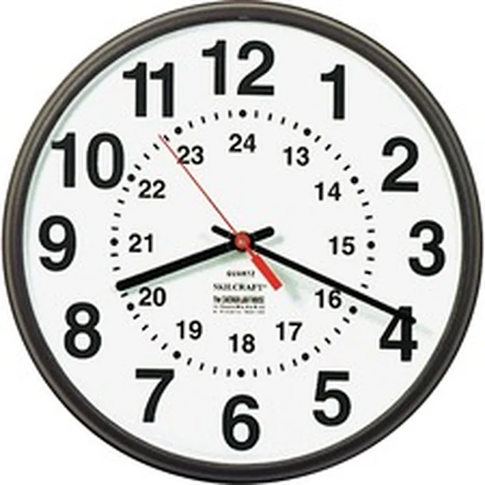 12-24 hour wall clock makes two revolutions every 24 hours. Design features a bronze frame, white dial face, black numbers and minute hands, and a red second hand. Quartz movement maintains 0.33 seconds per day accuracy. Slimline Wall Clock includes hanging hardware and runs on one AA battery (not included). Plastic clock frame will biodegrade within two years in landfills. Clock body contains 30 percent post-consumer recycled content.