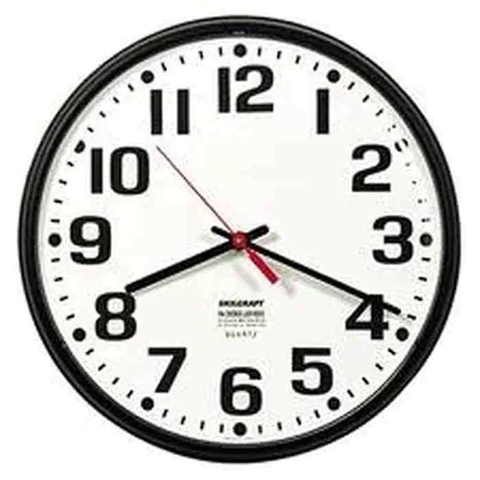 Round, low-profile wall clock features Quartz movement that keeps time to 0.33 second-per-day accuracy. Design includes a white dial face, easy-to-read black Arabic numbers, black markings, black minute and hour hands, and a red sweep second hand. Plastic clock frame will biodegrade within up to five years when placed in a landfill. All-plastic body contains post-consumer recycled material. Slimline Wall Clock uses one AA battery (not included) and includes hanging hardware.