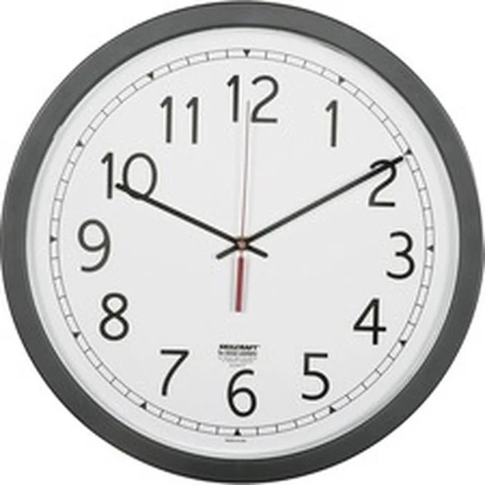 Round, slim-profile workstation clock features quartz movement with +/- 2 minute-per-year accuracy to keep you on schedule. The design also features black Arabic numerals and minute marks, black hour and minute hands and a red sweep second hand. 16-1/2" diameter wall clock uses one AA battery (not included). Flat plastic lens is UV-protected. Plastic body contains 30 percent post-consumer recycled content. Hanging hardware is included.