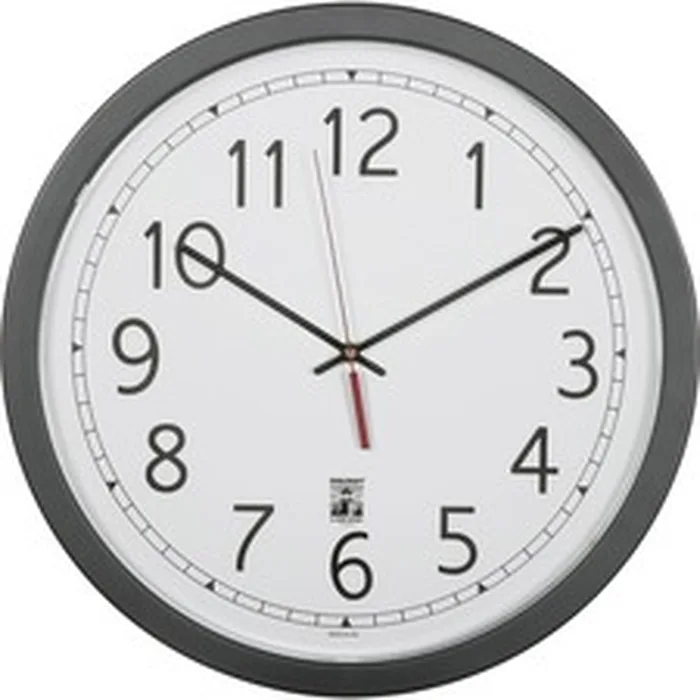 SelfSet clock is programmed to automatically set itself to Daylight Saving Time without the use of a signal. Ideal for use in facilities where a radio signal may not reach radio-controlled clocks. Wall clock features quartz movement with extremely accurate time (+/- 2 minutes per year) and includes a white dial with black Arabic numerals, black hour and minute hands. Design also includes a red second hand and a shatter-resistant, UV-protected clear lens. 16-1/2" diameter clock uses one AA battery (not included) and comes with hanging hardware. High-impact plastic body contains 30 percent post-consumer recycled material.