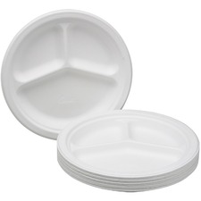 Rectangular, divided plates are made of pressed board paper or molded pulp fiber for extra resistance to water and grease. Main compartment covers 50 percent of plate, and two smaller compartments each cover 25 percent of plate. Compartment dividers are one-half as high as plate rim. Disposable plates are water-resistant and grease-resistant for durability. Flat-bottom, nesting design saves storage space. Plates meet FDA requirements.