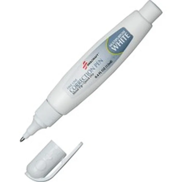 Multipurpose correction pen works on pen ink, faxes, laser and inkjet printers, copies, and more. Metal point applicator directs fast-drying correction fluid precisely where needed in a fine line. By varying the degree of pressure with which the barrel is squeezed, the flow of correction fluid can be regulated. Ergonomic cushion grip is made of nonslip rubber. Correction pen also features a durable plastic clip cap to attach to notebooks and pockets.