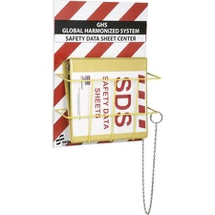 Globally Harmonized System Data Sheet Center Kit helps support compliance with the requirements of HazCom 2012 referred to as GHS. Kit includes everything you need to organize your Safety Data Sheet (SDS) information including a 14" wide x 20" high wall-mountable board and a 2" highly visible yellow organizing binder. Durable plastic board that reads "Safety Data Sheet Center" and a "Safety Data Sheets" insert in the binder easily identify the SDS location in large, industrial areas. Binder includes also includes 25 sheet protectors and A-Z dividers that help organize information for easy access. 2" binder holds up to 375 safety data sheets. A 36" plastic chain is attached to the binder to retain binder to the included wall rack. Sturdy, metal wire rack conveniently stores SDS binder. Rack mounts to the SDS board. This kit is produced by Americans who are blind. Purchasing this AbilityOne mandatory source product ensures your compliance with federal procurement regulations.