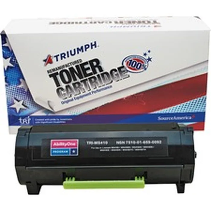 Remanufactured toner cartridge is designed for use in Lexmark MS410, MS415, MS510 and MS610 Series Printers. AbilityOne toner provides strategic opportunities to address a variety of customer needs including significant savings, guaranteed performance, compliance with executive orders and free recycling solutions. Plus, every purchase creates jobs for people with disabilities. TAA-compliant cartridge is assembled in the U.S.A., made using 35 percent post-consumer content and meets ISO 14001 recycling standards. Cartridge yields approximately 10,000 pages.