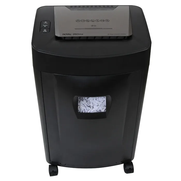 Royal 260MX 20 sheet CrossCut Shredder not only shreds paper but will destroy CD/DVD and credit cards. It is a long run shredder with a 60 minute run time. It has 8.5 gallon pullout bin and is on casters which makes it perfect for any office environment. Features: Duty Usage: Commercial/Office, Sheet Capacity: 20 Sheets in single pass, Cut Type:CrossCut, Cut Size: 5/32" x 1 1/8", Paper Entry: 8 3/4", Auto Start/Auto Stop Function: Photo Sensor Thermal Overload: Yes, Autostop on Paper Jam:Yes, Safety Features:Interlock Switch/Jam Free Rollers/Auto Reverse, Motor Type:DC, Speed: 7 seconds per sheet, Motor Size: 1 hp Basket Full Indicator:Yes, Basket Capacity:8.5 Gallons Pullout Bin, Cutter Warranty:5 years, Motor Warranty:5 years, Noise Level:63 db, Duty Cycle:60 minutes on/40 minute Off, Shreds CD/DVD:Yes, Shreds Credit Cards:Yes, Shreds Staples:Yes, Cabinet with Casters.