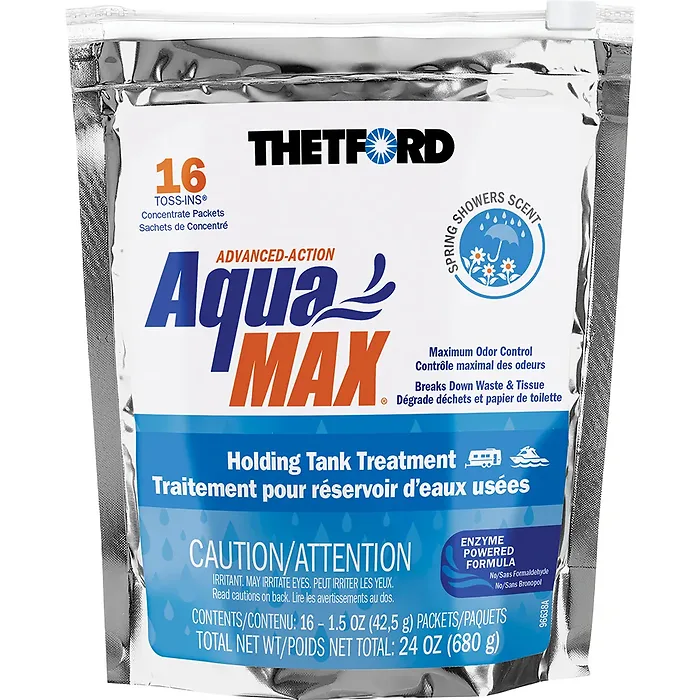 Thetford AquaMax® Holding Tank Treatment utilizes advanced enzyme-powered solutions to effectively neutralize odors and promote waste digestion, preventing issues like clumping, clogging, and tank residue. This treatment is free from harmful chemicals such as Bronopol and Formaldehyde, making it a safe option for users.