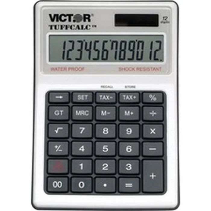 Washable TuffCalc is water-resistant and shock-resistant. Ideal calculator for extreme working conditions. Design features a sealed rubber keypad and acrylic-protected display. Large 12-digit display is easy to view. Functions include tax +/- keys, backspace, grant total, three-key memory, square root and change sign.