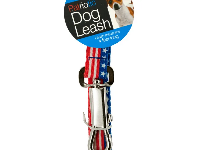 Great for the Fourth of July and all year round, this Patriotic Dog Leash features a fun United States flag design with stars and stripes. Leash is made with sturdy nylon with a metal latch that can be attached to a collar and a looped handle for a secure hold. Leash measures approximately 47" long; leash clip measures 3 1/4". Total length is 50 1/4". Total width is almost 3/4". Comes in assorted styles. Comes packaged with a hang tag.