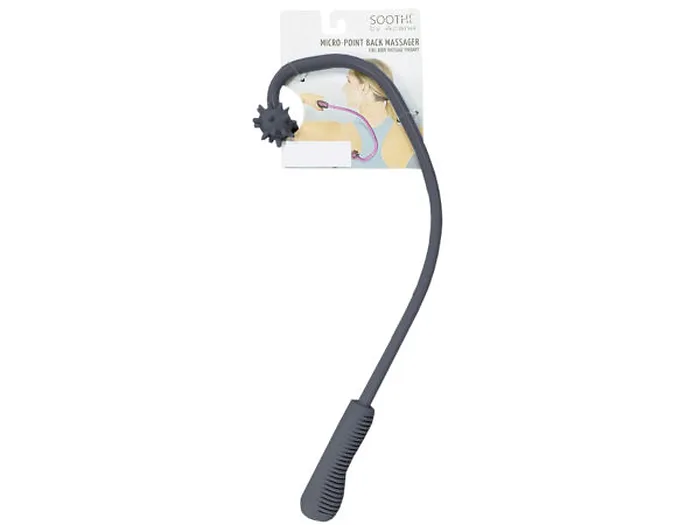 The Soothe Micro-Point Back Massager By Apana has a long, curved handle so you can comfortably reach it all over your body. Easily reach your back, neck, behind your legs, the bottom of your feet, and more! The ball tip has micro-points for deep tissue massage to help stimulate muscles. The ergonomic handle provides a tight and secure grip while you massage. Perfect for after workouts, pampering after a long day, or to help soothe muscle aches. Comes in black only. Measures 18"long. This self-care tool comes packaged on a hanging card.