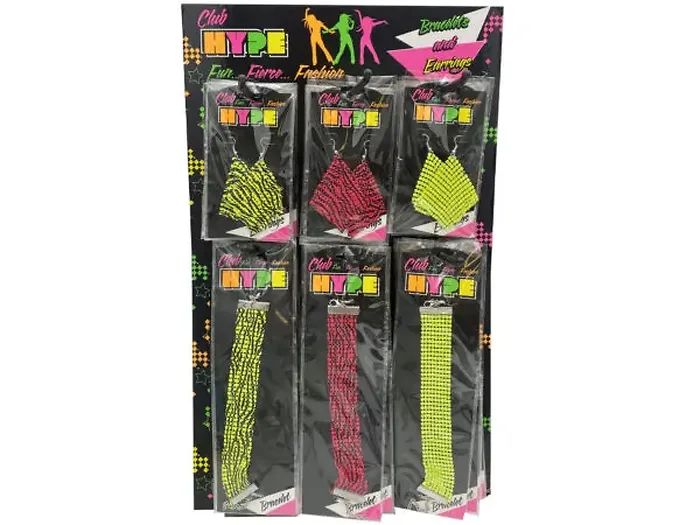 Each set features unique styles in neon colors: zebra and solid options in yellow, pink, orange, and green. The lightweight mesh material ensures comfort, while the chrome hook earrings and lobster claw closure bracelets make these pieces easy to wear.