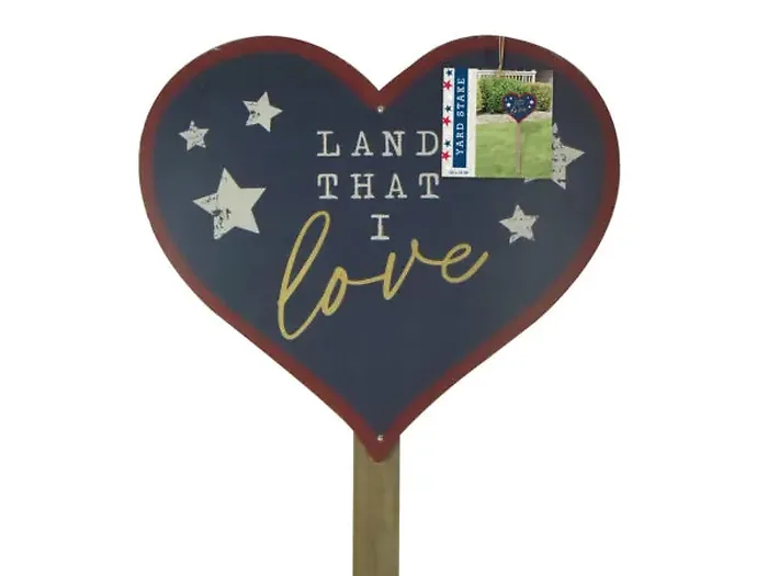 Show your love for the USA with this charming 16" x 40" patriotic yard stake. Crafted from sturdy MDF wood, this heart-shaped sign boasts a vintage farmhouse style with vibrant red, beige, and dark blue colors. Its convenient stake bottom allows for easy placement in your yard, garden, or even in a potted plant. Perfect for celebrating holidays such as the 4th of July, Memorial Day, and Veterans Day, this decorative piece adds a touch of Americana to any outdoor space.
