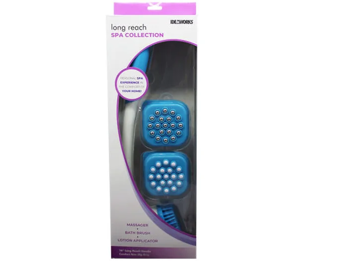 Create a personal spa experience in the comfort of your home with this IdeaWorks Long Reach Spa Collection Bath and Shower Scrubber Set. This 16" long reach handle has interchangeable heads for the ultimate spa experience. Includes 3 different heads! The lotion applicator has 19 soft rolling lotion applicators. The massager has 19 smooth, rolling stainless steel massage beads. The bath brush has over 130 soft massaging bristles. Pair this self-care must-have with your favorite lotion. Makes a great gift! Comes packaged inside a hanging window box.