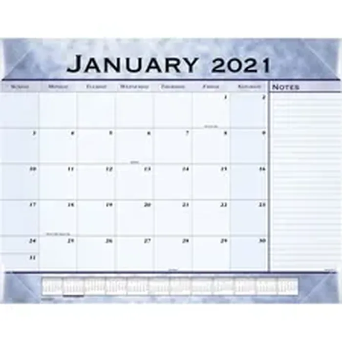 Desk pad features a stylish, blue marble background on each monthly page. Dated planning pages range 12 months from January to December. One-page-per-month format also includes daily blocks (2-7/16" x 2-1/4"), Sunday-through-Saturday scheduling, holidays, full-year calendar reference along the bottom and ruled notes column. Desk pad also features bonus pages with current and future yearly reference calendars and a dates to remember page. Four poly corners frame the desk pad. Calendar pages are printed on quality paper.