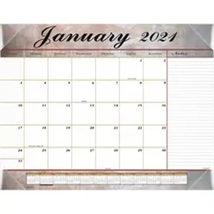 Desk pad features a stylish, burgundy marble background on each monthly page. Dated planning pages range 12 months from January to December. One-page-per-month format also includes daily blocks (2-7/16" x 2-1/4"), Sunday-through-Saturday scheduling, holidays, full-year calendar reference along the bottom and ruled notes column. Desk pad also features bonus pages with current and future yearly reference calendars and a dates to remember page. Four poly corners frame the desk pad. Calendar pages are printed on quality paper.