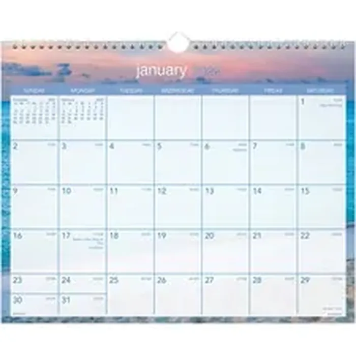 Escape to the beach with this tropical wall planner. The photographic background includes warm sand, turquoise water and palm trees. Wall planner offers convenient monthly planning with a different beach photo each month. The photo is ghosted behind the calendar grid. Dated planning pages range 12 months from January to December. One-page-per-month format includes unruled daily blocks (2" x 1-3/4"), Sunday-through-Saturday scheduling, count of days/days remaining, holidays, and past and future months reference. Wall planner also features wire binding with a hanging loop and full chipboard back.