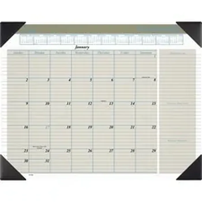 Executive monthly desk pad lets you plan your month like a professional and track your schedule, priorities, phone calls, and messages. Dated planning pages range 12 months from January to December. One-page-per-month format features three-color graphics, ruled daily blocks (2-5/16" x 2-9/16"), Sunday-through-Saturday scheduling, holidays, full-year calendar reference, and ruled columns to record top priorities, important phone calls and message reminders. Desk calendar also includes current and future yearly reference calendar and a dates to remember page. Four black poly corners frame the desk pad and help secure your planning pages.
