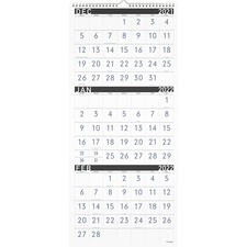 Wall calendar makes it easy to look to the future with three months of reference all on the same page. Unique binding lets you move each month to a new position so no need to rewrite anything. The past, current and future months are printed in equal size in a vertical format. Dated planning pages range 15 months from December to February. Monthly entries have large, easy-to-read numbers in ruled daily blocks (1-5/8" x 1-3/16"); numbered weeks; count of days/days remaining; Sunday-through-Saturday scheduling; and federal holidays printed in red. Wire binding at top is equipped with a built-in hanger for easy wall-mounting. Full chipboard backing provides a sturdy backing for writing. Wall calendar is printed red and blue ink on quality paper.