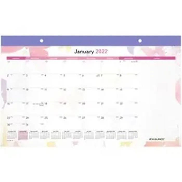 Calendar desk pad offers a colorful addition to your desktop with a bright, watercolor background in a different color each month. Compact size is perfect for small or crowded work spaces. Dated planning pages range 12 months from January to December. One-page-per-month format includes ruled daily blocks (1-7/8" x 1-3/8"), Sunday-through-Saturday scheduling, numbered weeks, holidays, large ruled notes column, and past, current and 10 future months reference. Desk pad also has a blue headband and two clear poly corners to secure the monthly pages.