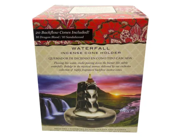 Experience the enchanting flow of smoke with our Mystical Waterfall Backflow Incense Burner. This captivating piece allows smoke to cascade like a waterfall, creating a serene and mystical atmosphere in any space. The set includes 20 fragrant backflow incense cones — 10 in the exotic scent of dragon blood and 10 in soothing sandalwood. The shallow dish at the top holds the cones securely, while the unique design channels smoke gracefully down the front.