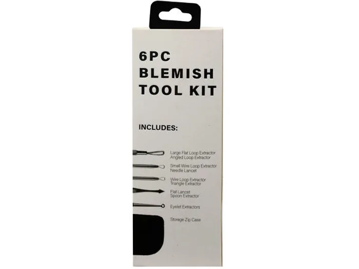 The 6 Piece Pro Blemish Tool Set is expertly designed as a safe alternative to fingers and pinching to help banish blemishes and transform skin by extracting whiteheads and blackheads for long-lasting results. The 5-piece tool set includes 1 double-sided loop extractor, a small wire loop extractor with a needle lancet, a wire loop extractor with a triangle, a flat lancet with spoon extractor, and a zipper storage case. This self-care essential is the perfect size to keep in your medicine cabinet, beauty bag, or take with you on the go. Comes packaged inside a hanging shelf box.