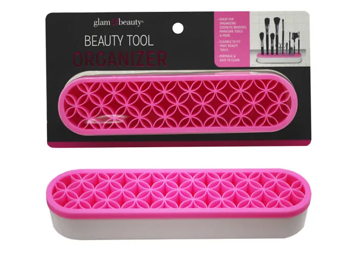 Keep your beauty tools organized and accessible with Silicone Beauty Tool Organizer by Glam Beauty. Made from high-quality silicone material, this beauty tool organizer is durable and easy to clean. It features multiple compartments of varying sizes, perfect for storing makeup brushes, eyelash curlers, tweezers, and more. The soft and flexible silicone material helps prevent damage to your beauty tools, keeping them pristine. The compact size of this organizer makes it ideal for small spaces yet still provides ample storage for your beauty tools. Plus, with its sleek and modern design, it adds a touch of glamour to your vanity area. Also great for holding craft tools! Comes in assorted colors hot pink, teal, and grey. It's stylish design and practical functionality makes it a popular item among beauty enthusiasts and a great addition to any beauty store's inventory. A must-have item for any makeup lover or beauty store. Its durable construction, multiple compartments, and sleek design make it the perfect solution for keeping your beauty tools organized and accessible. This beauty tool organizer is available in an assorted color pack on a clip strip, making it easy to store and display in your retail store.