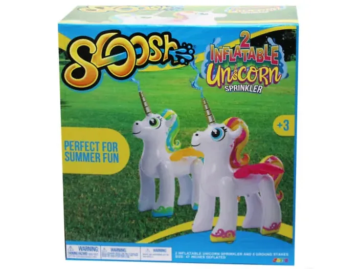 Beat the heat this summer with the Sloosh 48" Unicorn Sprinkler 2-Pack! These charming unicorn sprinklers will add a magical touch to any backyard, offering endless fun for children and adults alike. Each unicorn stands at 48" and comes with 8 ground stakes to ensure they stay anchored during playtime.