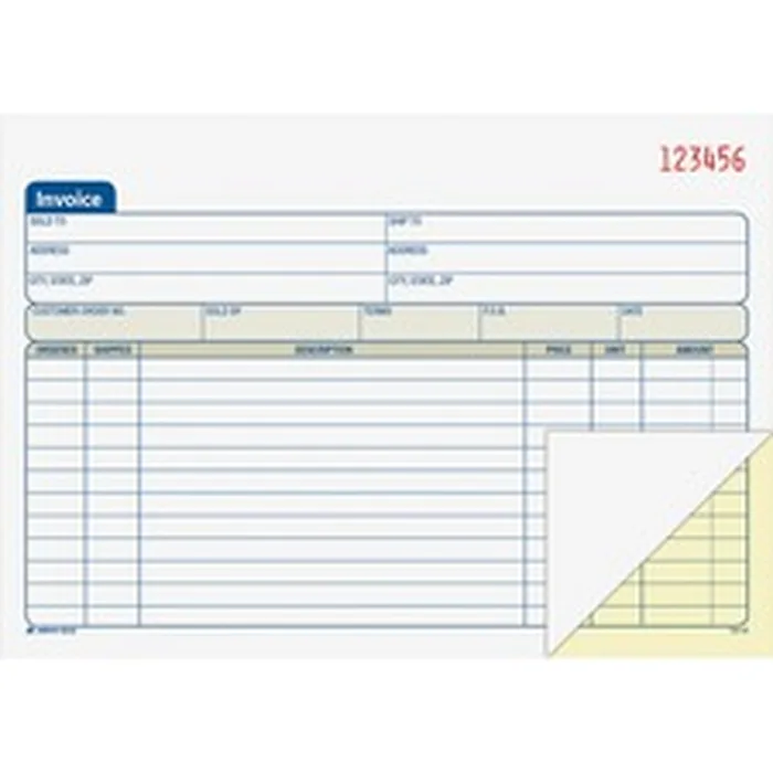 Carbonless invoice book contains sets of two-part carbonless forms for invoicing customers. Each set has a white original and canary duplicate. Each form has a space for buyer's information, shipping address, date of invoice, and a list of 11 product descriptions including date ordered, date shipping, price, unit and amount. Forms are consecutively numbered. Tapebound book features a space at the top for your company stamp and a wraparound cover attached to the back to place between sets.