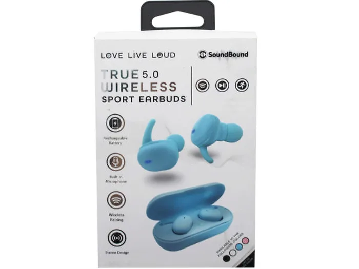 The Sound Bound True Wireless Rubberized Sport Bluetooth Earbuds are the perfect choice for those who demand the best sound quality and convenience. These earbuds are designed to deliver high-quality sound in a compact and lightweight design, making them perfect for sports and other physical activities. The earbuds are wireless and connect to your device via Bluetooth, providing excellent sound quality without wires. The rubberized sport design ensures that the earbuds stay securely in place during even the most intense workouts, while the compact design makes them easy to store and transport. These earbuds are designed to deliver exceptional sound quality, with powerful bass and crystal-clear treble. The noise-canceling technology ensures you can enjoy your music without distractions, while the built-in microphone allows you to take calls hands-free. The earbuds come with a charging case that provides up to 4 hours of listening time, and the earbuds themselves are water-resistant, making them perfect for use in any weather conditions. The case also doubles as a convenient storage container, allowing you to keep your earbuds safe and secure when not in use. This electronics must-have comes packaged inside a hanging color box.