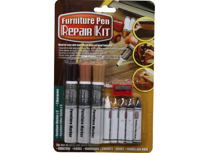If you're tired of looking at nicks, scratches, and scuffs on your furniture, the Furniture Repair Markers are the perfect solution! These handy markers and wax sticks make it easy to touch up and restore the look of any wood surface in your home. The set includes a variety of markers and sticks in different colors so that you can find the perfect match for your furniture. The markers are designed to quickly and easily cover scratches and scuffs, while the sticks are perfect for filling deep gouges and holes. They're water-resistant and provide long-lasting coverage that won't fade or smudge. Using the Furniture Repair Markers and Sticks is easy. Simply choose the appropriate color and apply the marker or stick to the damaged area. Then, use a cloth or your finger to blend the color with the surrounding wood. It's that simple! Set includes 3 markets, 5 colored wax sticks, and 1 sharpener. This household essential comes packaged in a blister card.