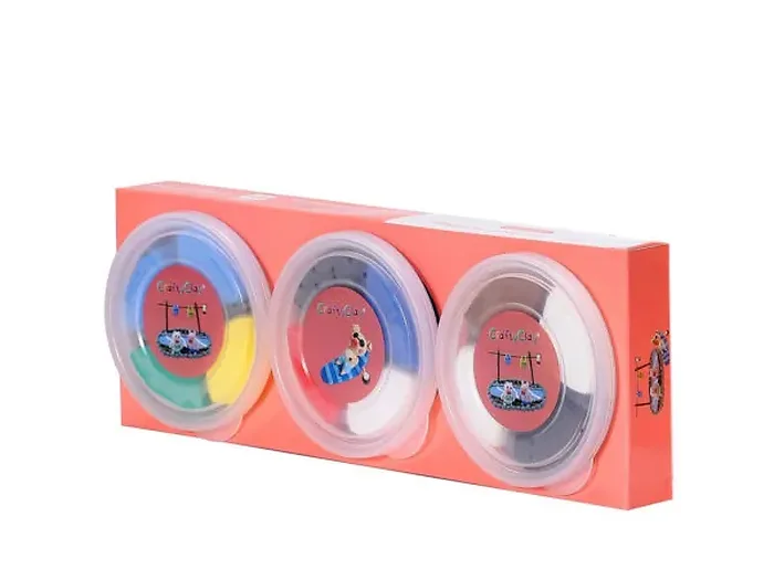 The Crafty Clay 3 Cup Set is an air-dry modeling craft kit for kids featuring a delightful Holiday theme. This kit offers three cups of non-toxic, easy-to-mold clay, each containing four vibrant colors. Each cup is adorned with color stickers on the top, showcasing suggested artwork designs.