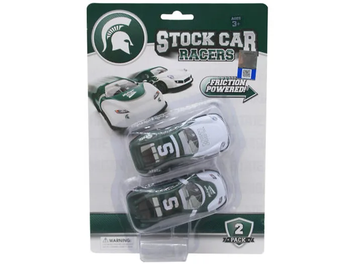 The NCAA Michigan State Friction-Powered 2-Pack Stock Car Racers is a must-have for any fan of Michigan State athletics! The NCAA officially licenses this product and features two stock cars decked out in the signature green and white colors of the Michigan State Spartans. Each car is made with high-quality materials, ensuring durability and long-lasting enjoyment. The attention to detail on these cars is impressive, with each one featuring the Michigan State logo and graphics prominently displayed on the hood and sides. These cars are perfect for display or play, and are a great addition to any collection of Michigan State memorabilia. The 2-Pack ensures that you have a car to proudly race against your friends or display in your home or office. A great way to introduce young fans to the excitement of NASCAR racing. The NASCAR-style design and vibrant colors make these cars a fun and exciting addition to any toy collection. Comes packaged in an officially licensed card with a holographic emblem.