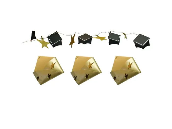 Celebrate your graduation in style with our exclusive set of gold metal ornaments and a festive banner. This beautifully designed set includes six shimmering gold ornaments paired with a striking metal banner that features eight delightful metal graduation caps and gold stars. Perfect for adding a touch of elegance to any graduation party or celebration!