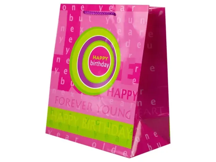 Gift your present with style using the Forever Young Pink and Green Birthday Gift Bag. This medium-sized bag features a cheerful design with the uplifting messages: "one year older but younger next year" and "forever young at heart". It's perfect for celebrating birthdays while conveying a positive sentiment.