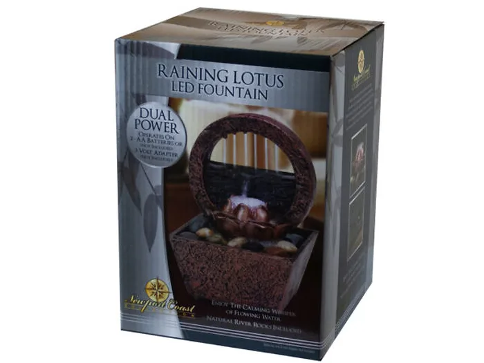 Relax and enjoy the soothing sounds of water anywhere in your home with the Small Raining Lotus LED Fountain. Just add water for a peaceful soothing effect that compliments any decor. Enjoy the calming whisper of flowing water with the included natural river rocks. The fountain is dual powered by either using a 3-volt adapter or 2"AA" batteries, not included. Fountain measures 4.5" x 4.5" x 7".